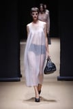 Miuccia Prada and Raf Simons's creative collaboration yielded yet another intriguing collection titled "Touch of Crude." On a runway outfitted with brown carpeting, models walked to the beat of sci-fi music, their faces done in an eccentric way with long eyelashes that seemed to obscure their vision. The self-referential show opened on a somber gray tailoring ensemble, consisting of a long coat layered over a button-down shirt and skinny pants. The catwalk explored themes of business dressing and domestic living, borrowing elements from previous collections to present them in the ugly-chic fashion Prada excels at. For example, a series of dark and colorful dyes seemed to be dripping from a strapless column gown, a slip dress, and skirt sets as if the designers intentionally set out to give them an unfinished look. Similarly, a lineup of knit ensembles with raw edges and crinkled accessories expanded on that sentiment.